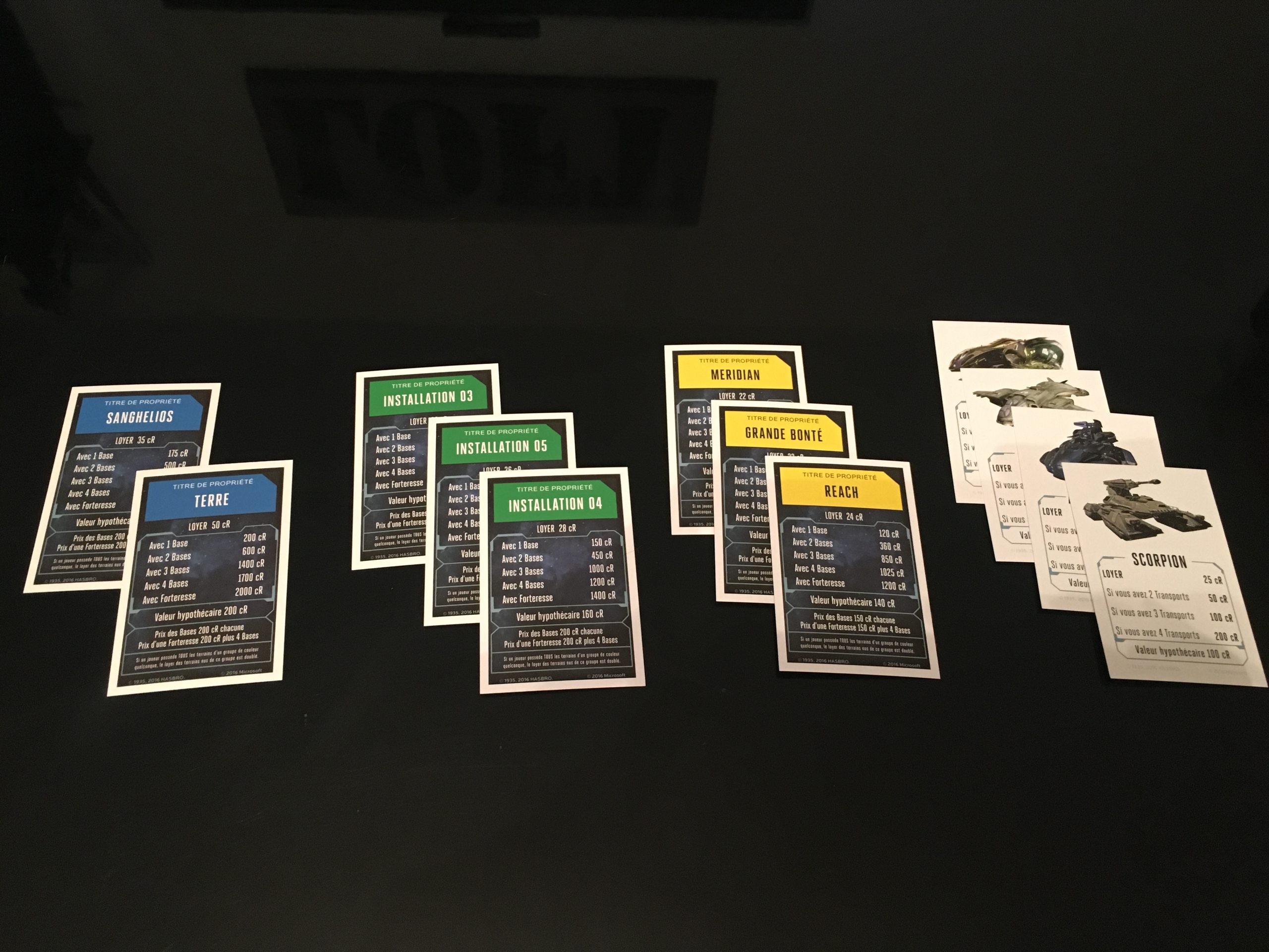 On trouve ensuite un grand nombre de cartes : les cartes des diverses propriétés, et les cartes Chance et Caisse de Communauté qui ont été respectivement renommées en IA et Citations. Le design des cartes a été travaillé avec divers symboles tout droit tirés l’univers Halo, ce qui est un bon point pour l’immersion.