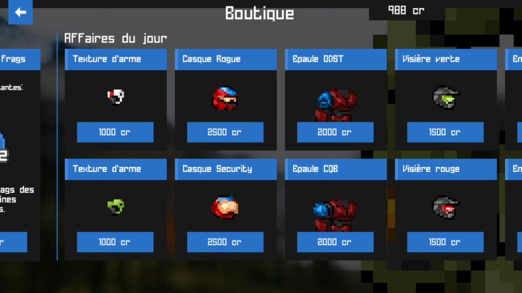 A noter que l’ensemble des éléments cosmétiques ne sont pas disponibles dès le départ. Vous pourrez en acheter dans la boutique (disposant d’un roulement aléatoire quotidien) contre des crédits et monter en grade pour débloquer des éléments uniques tels que l’armure dorée ou le casque enflammé !