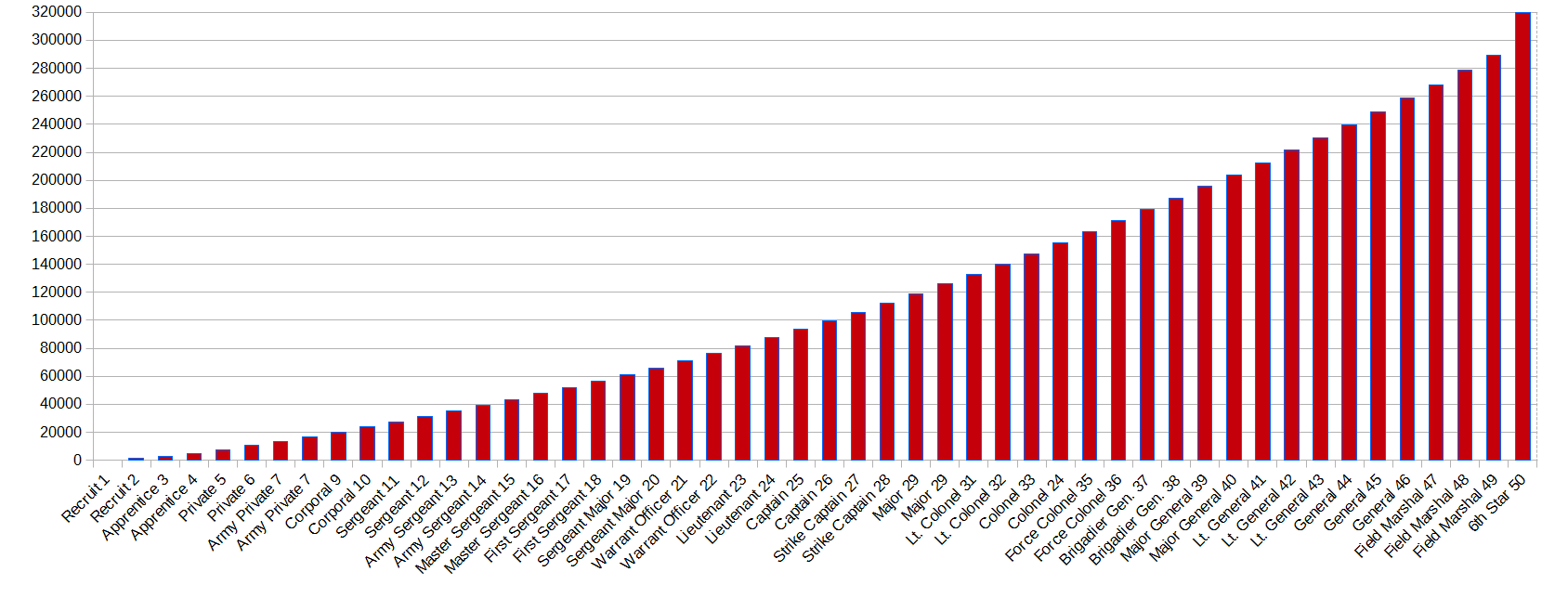 #J'aimelesgraphes À noter les noms des grades ultra-chelous, avec une différenciation Private/Army Private, des grades qui n'existent pas comme Strike Captain ou Force Colonel, et pour la première fois l'inclusion d'un grade absent des forces militaires américaines : Field Marshal.