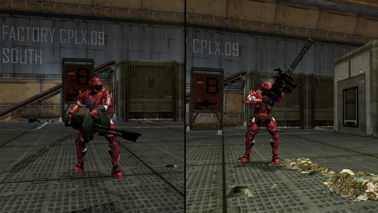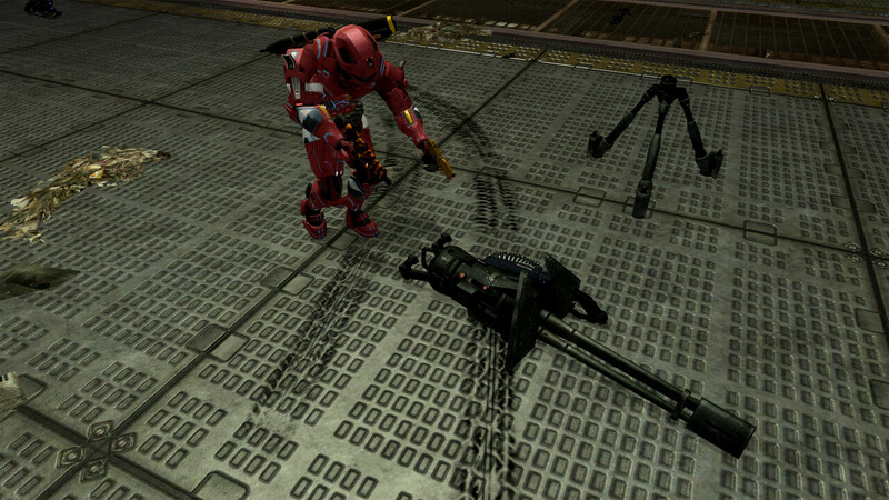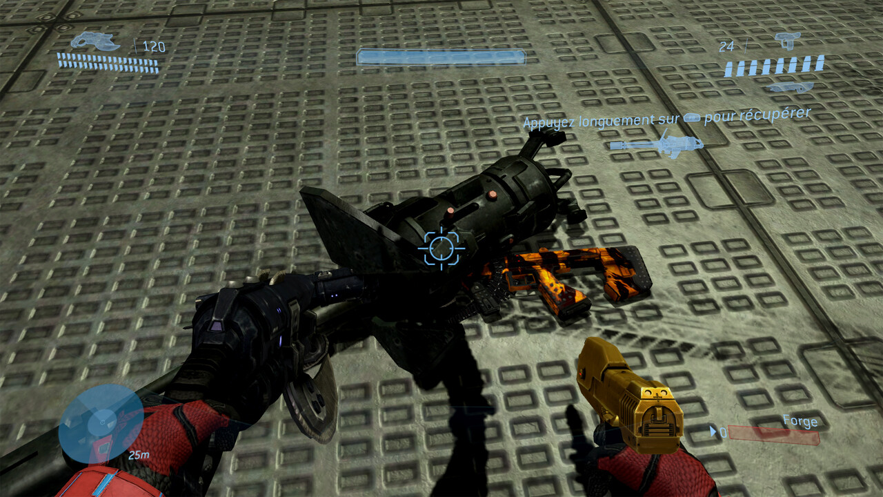 Hello a tous, Ce qui est marrant avec ce tricks c'est qu'il est possible de le réaliser partout partout, que ce soit campagne, partie perso, forge et même multijoueur. Pas besoin d'être le host pour faire ce tricks, tout les joueurs peuvent le faire. Ce tricks ne marche pas avec la version covenant de la mitrailleuse. Vous aurez besoin d'une mitrailleuse UNSC et de trois armes duals : Prenez une mitrailleuse, détaché la puis posez la dans les armes duals, puis prenez une armes dans chaque mains : Maintenant placez-vous de sorte qu'il y est écris de prendre la mitrailleuse puis vous allez faire le combo LB+RB (comme si vous voulez prendre la mitrailleuse et l'arme dual restante) : Si la manipulation a été réussite vous vous retrouverez en train de tenir votre mitrailleuse vers le ciel : Différence entre la position normal et celle du tricks :