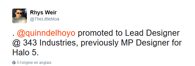 Autre changement de rôle chez 343 Industries : Quinn DelHoyo a été promu au poste de Lead Designer, après avoir été Lead Multiplayer Designer lors du développement de Halo 5 : Guardians.