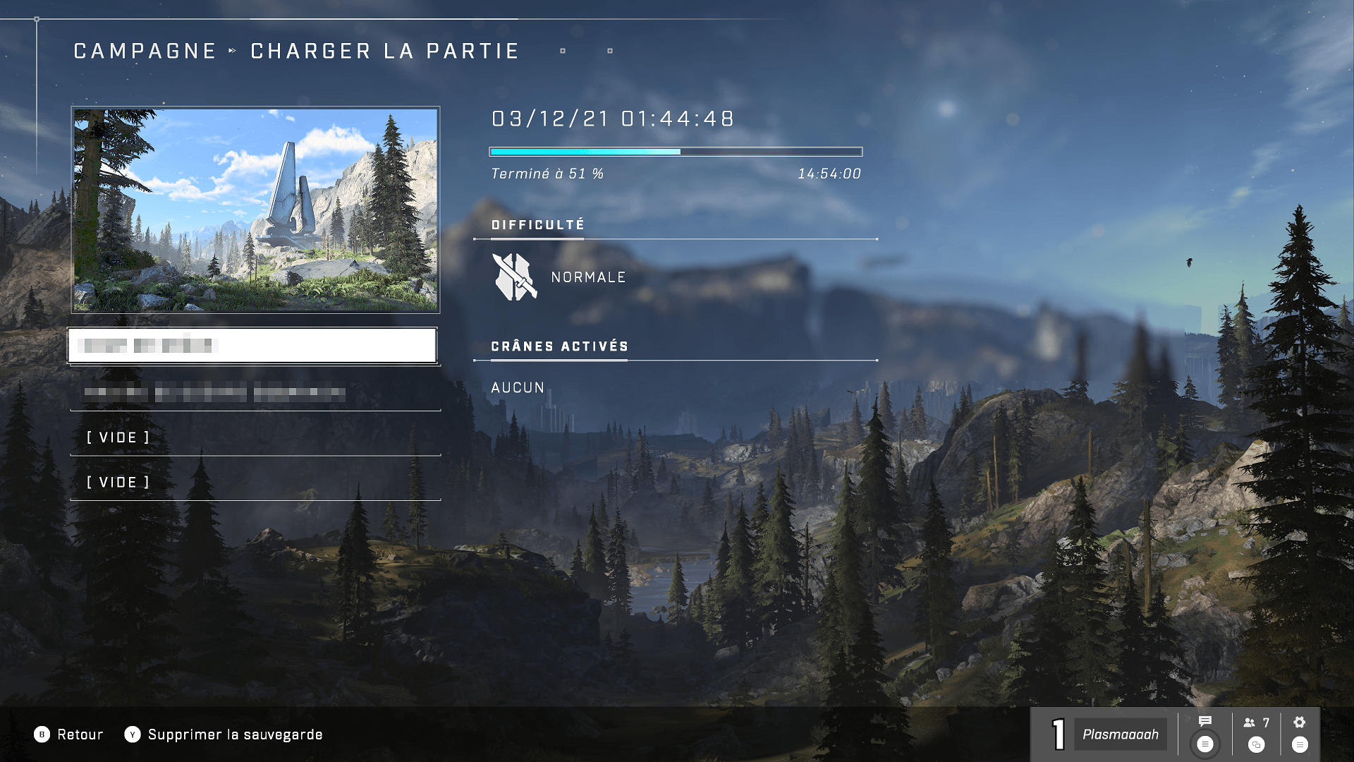 Pour contre-balancer ce problème particulièrement handicapant, le jeu propose cependant plusieurs emplacements de sauvegardes, avec une progression partagée pour les fichiers audios et les crânes. En effet, fini l’aspect sélection de mission au menu principal sur Halo Infinite, le jeu propose ici 4 emplacements distincts de sauvegardes parallèles pour la campagne, que vous pouvez reprendre à tout moment en chargeant la sauvegarde correspondante.