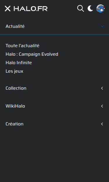 D’ailleurs, quand on active le dark mode de la barre de navigation pour la passer en blanche, le logo Halo.fr reste en blanc, ce qui ne le rend pas lisible. Petit passage en QA.